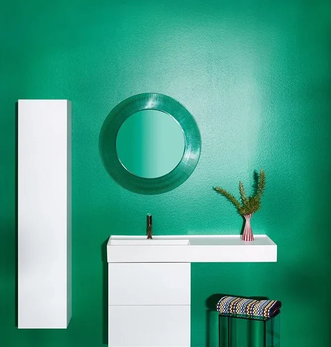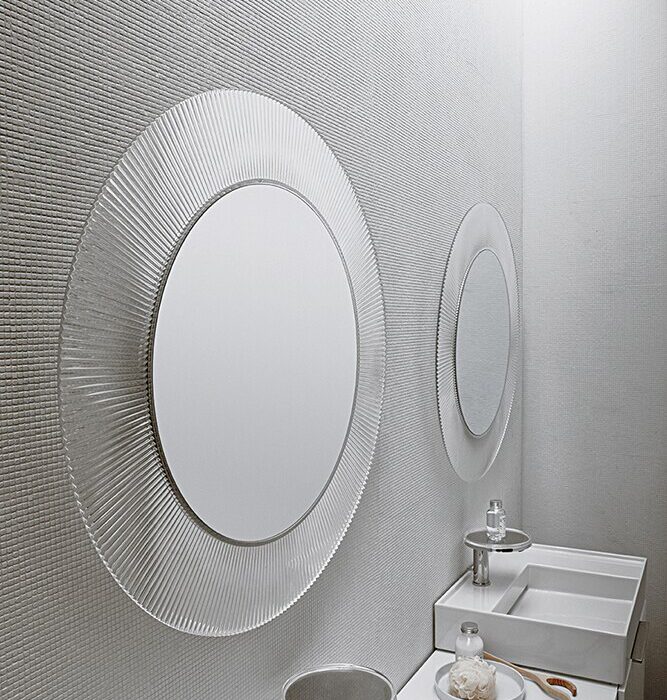 Stilig og klassisk rundt speil med lys bak fra Kartell.