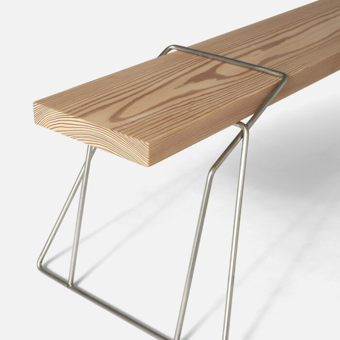 Torben Skov’s long career as a graphic designer is clearly reflected in his furniture. In its structure, the Bench is almost like lines drawn in the air. The horizontal wooden plank, the slanted load-bearing steel legs – both parts strict geometric compositions, which simultaneously pay homage to the architectural principle of the distinction between the bearing and the borne. The two vertical structures bearing the horizontal plane. In this piece of furniture, the tension from the plank and the weight of the person sitting, or the weight of the things placed on the Bench, help to lock the structure in place.