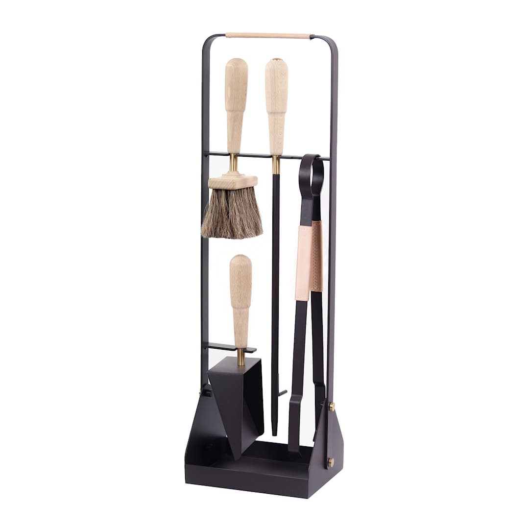 Stilig peissett med alt du trenger til ildstedet ditt. Produsert i lakkert metall med messingdetaljer og Tärnsjö skinn. Tredetaljene er fra bærekraftig skogbruk.