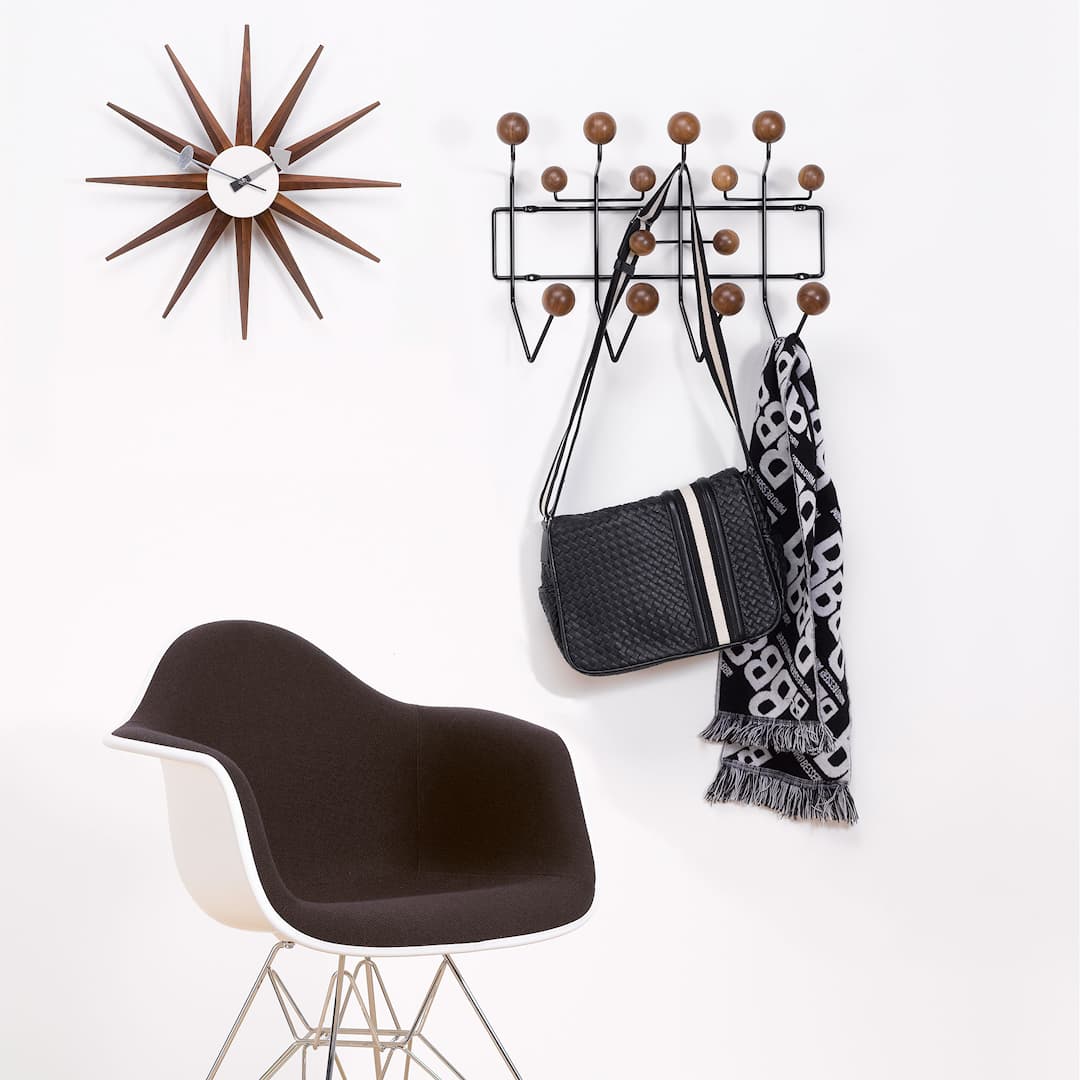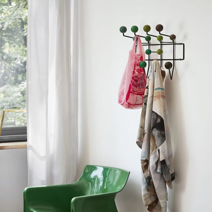 Hang it all ble designet av duoen Charles & Ray Eames i 1953. Knaggrekken er leken i formen og glade farger skal oppmuntre barn til å henge opp klærne med glede, istedetfor å kaste de på gulvet.