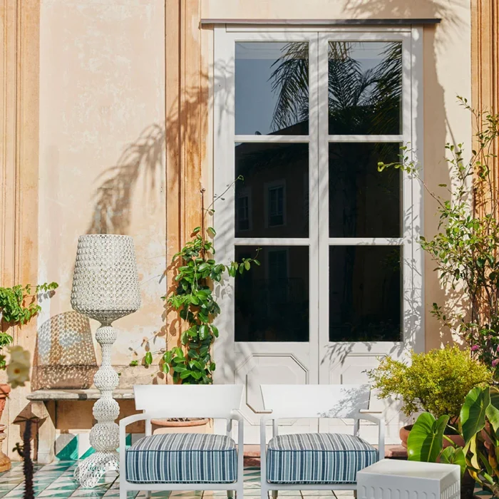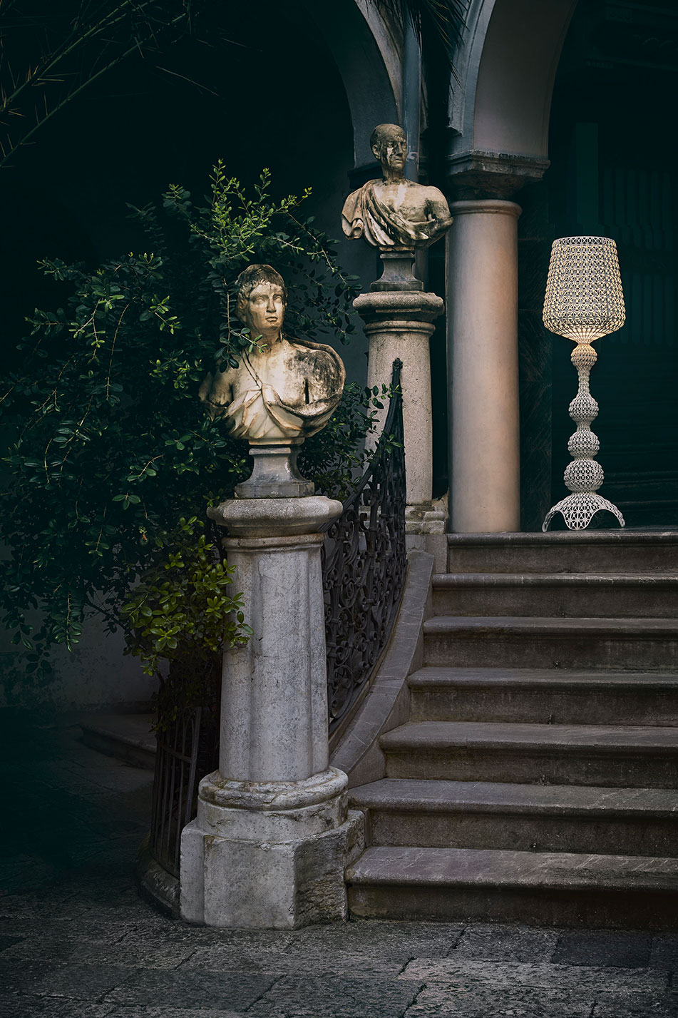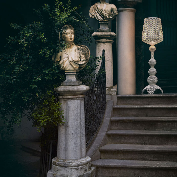 Kabuki serien ble designet av Ferruccio Laviani for Kartell i 2017. Lampene ser ut som gamle kniplingsbroderier og løfter ethvert rom. Kommer som gulvlampe for innendørs og utendørs bruk, samt en bordlampe og en pendel.