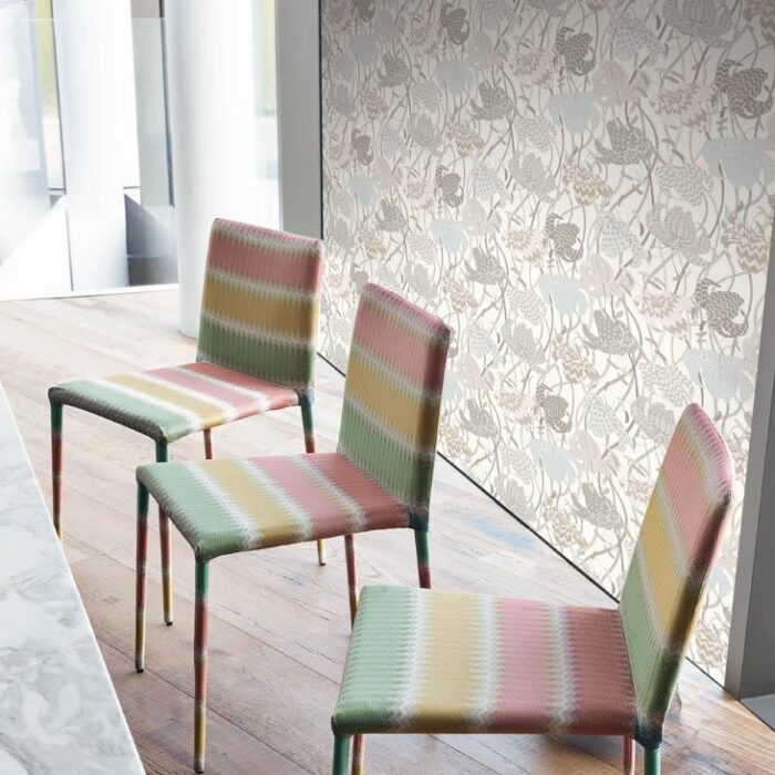 Nydelig vinyltapet fra Missoni Home. Overflaten gir inntrykk av at tapeten er vevd og gir en lun og god følelse i rommet. Kan vaskes. 1 rull er 10,05cm lang og 100cm bred. Rapport på 64.
