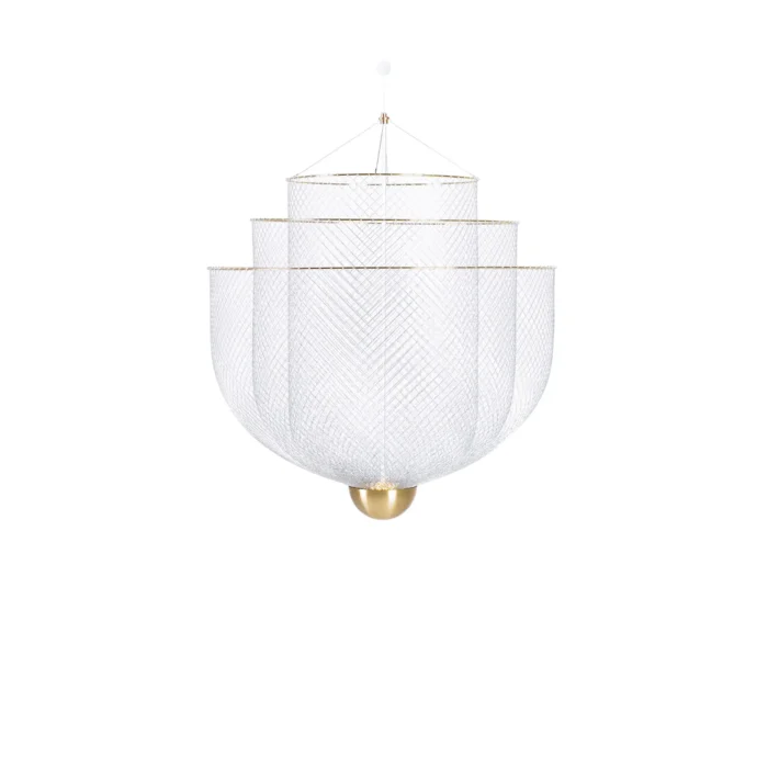 Lampen er konstruert av et enkelt metallnett i 3 lag og har nydelige detaljer i polert messing noe som gjør at den gir et behagelig lys i rommet.