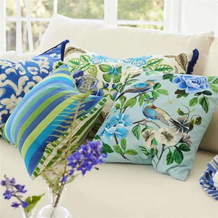Sommerlig brodert pyntepute fra Designers Guild med blomster og fuglemotiv på forsiden og sommerfugler på baksiden.