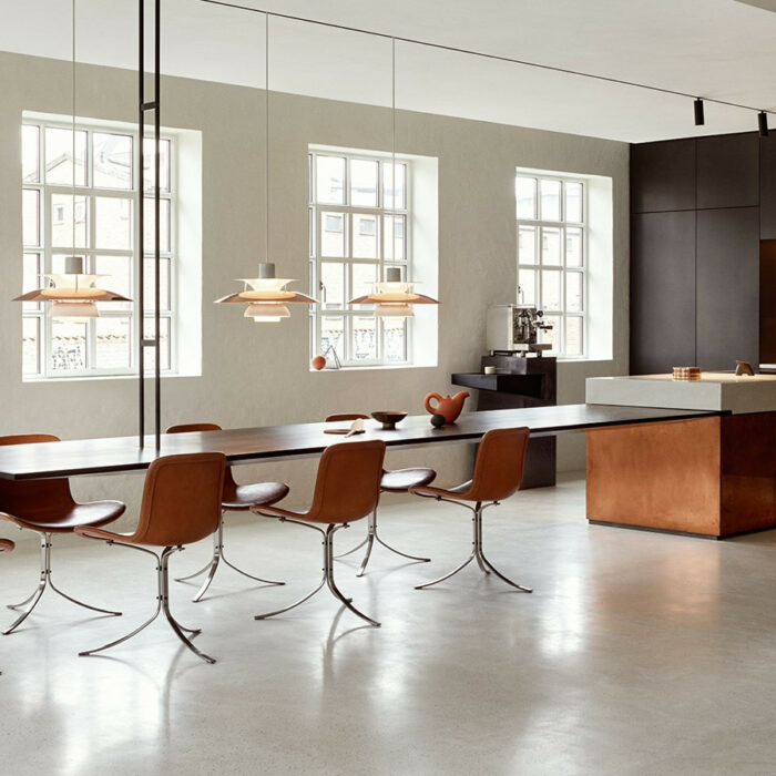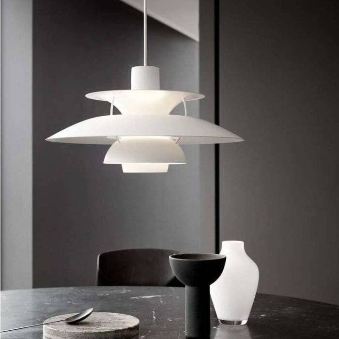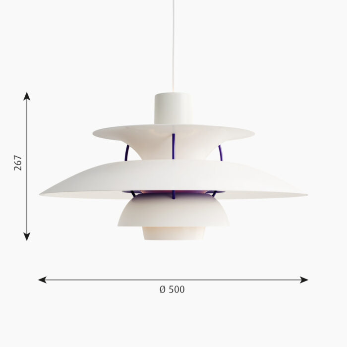 PH5 Pendelen ble designet i 1958 av Poul Henningsen, som en reaksjon på de konstante endringene i lyskildens form og størrelse. Med designet hans kan du plassere lampen i nøyaktig den høyden du ønsker og med lyskilden som passer dine behov, uten å bli blendet av lampens lys.