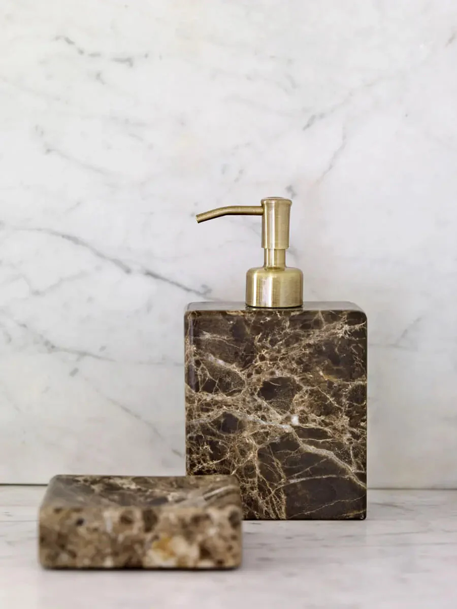Såpedispenser i brun marmor og messingfarget rustfritt stål.
