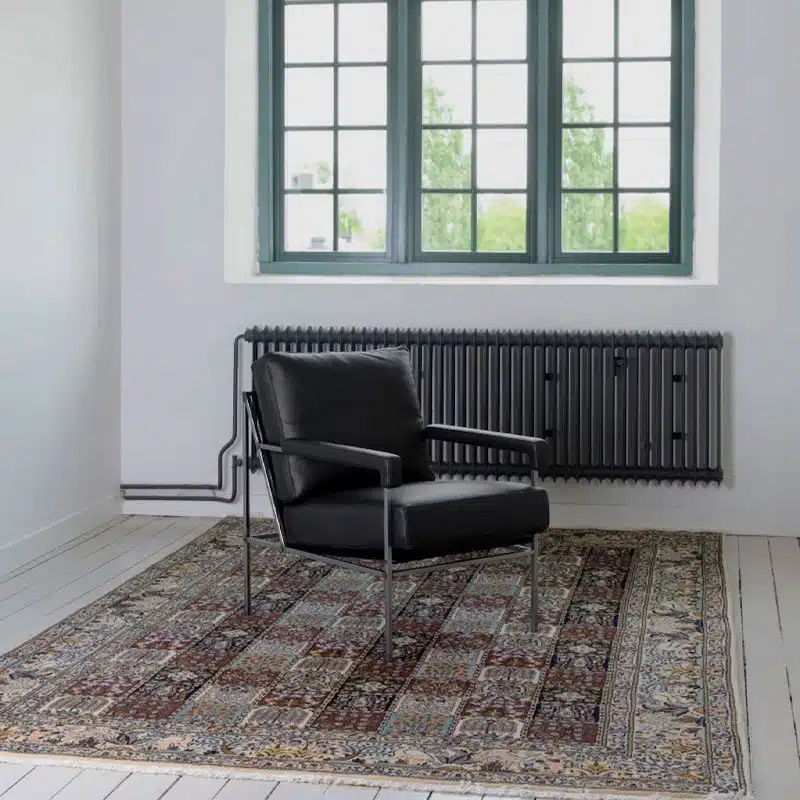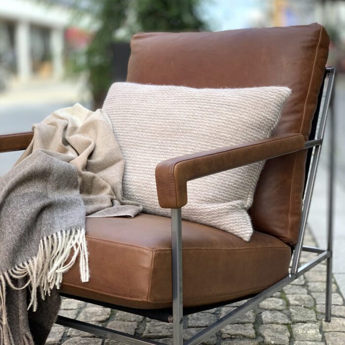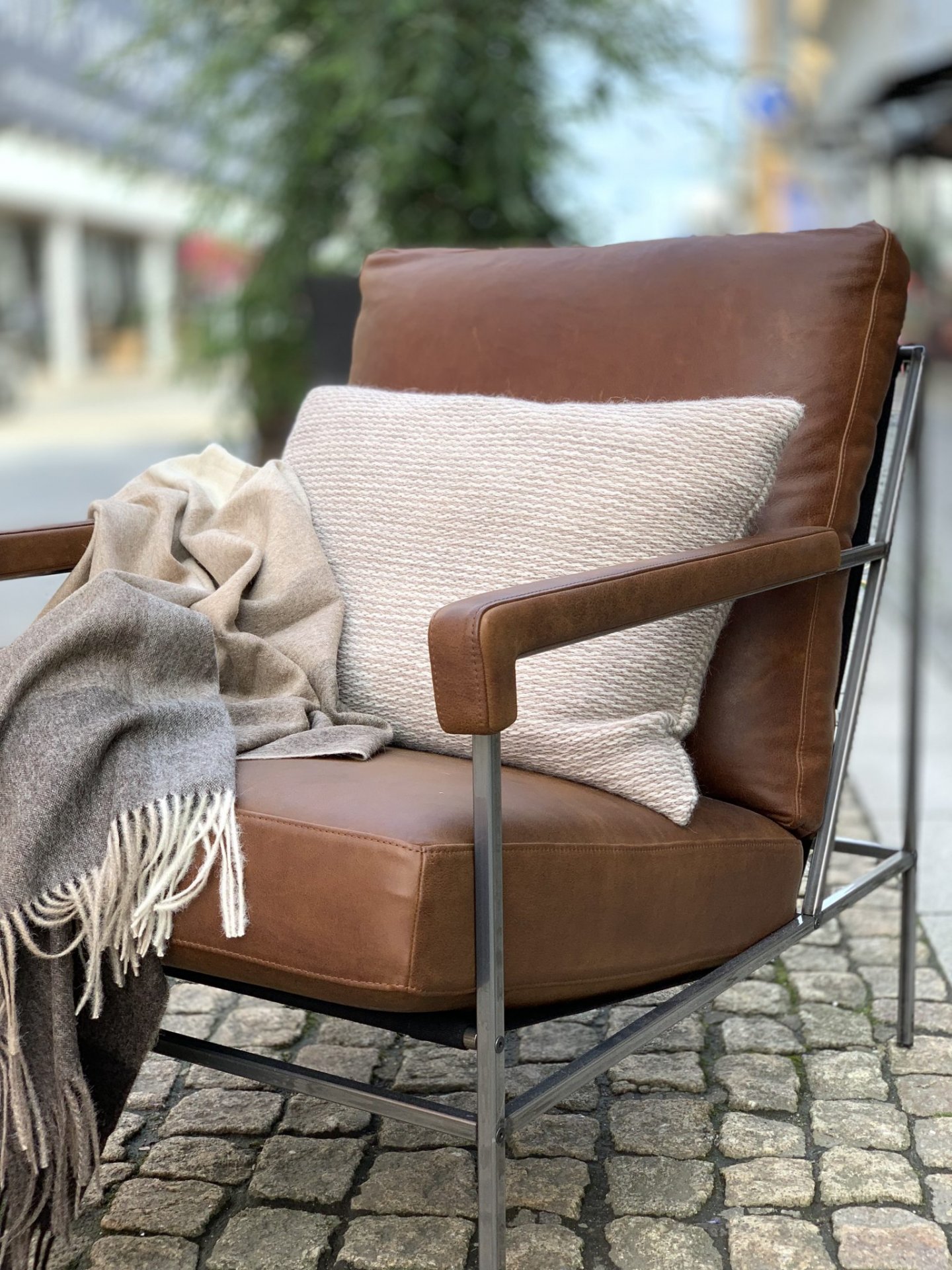 Velg mellom ulike skinn eller tekstiler. Her selges stolen med klarlakkert understell, dette kan også fåes i sort.