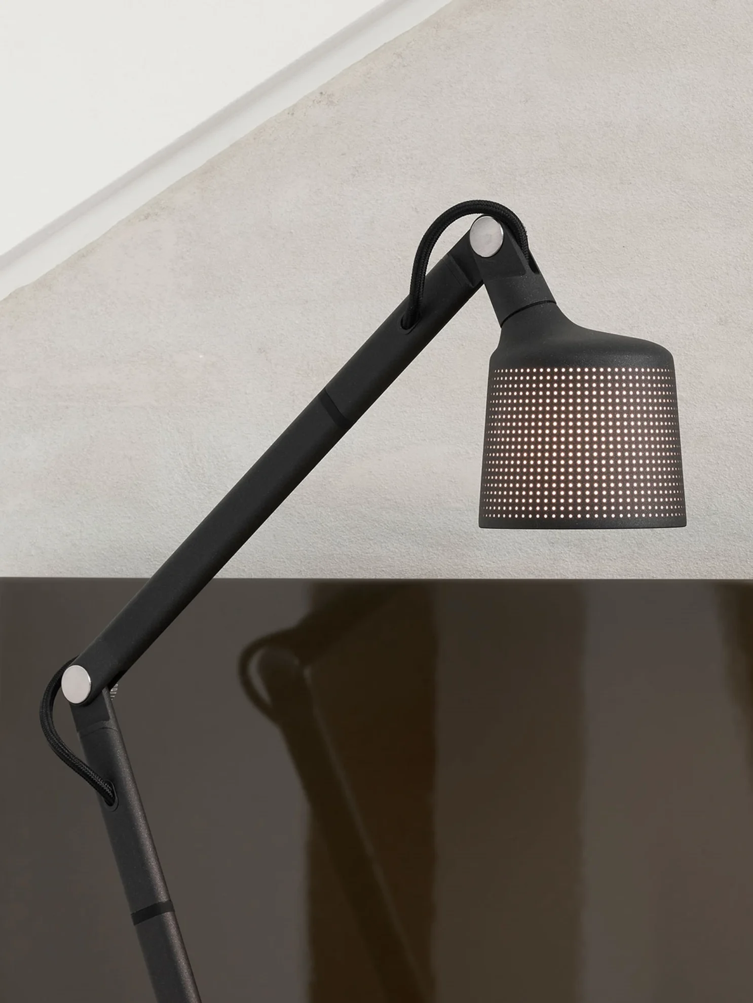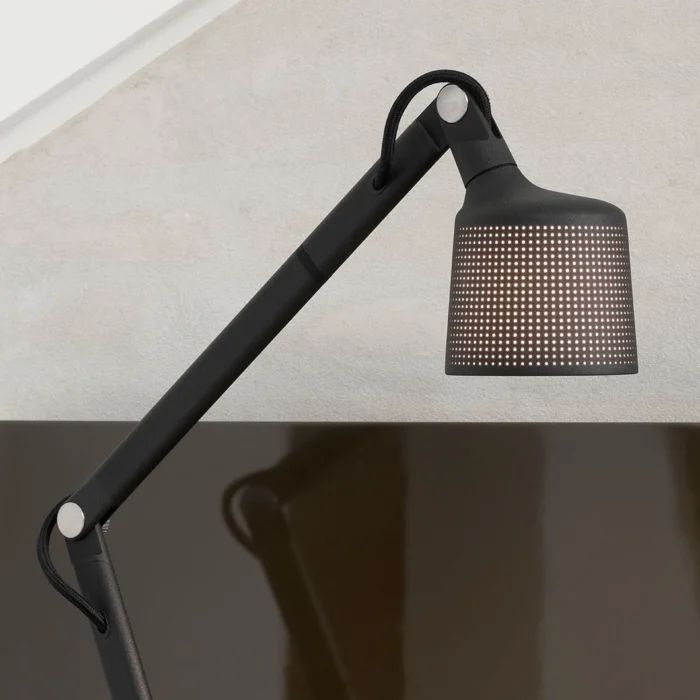 Vipp521 skrivebordslampe skrus fast i bordplaten og har en lampeskjerm som er perforert, noe som gjør at lyset blir kastet mykt ut gjennom hullene. Det er en veldig fin arbeidslampe som gir godt lys.